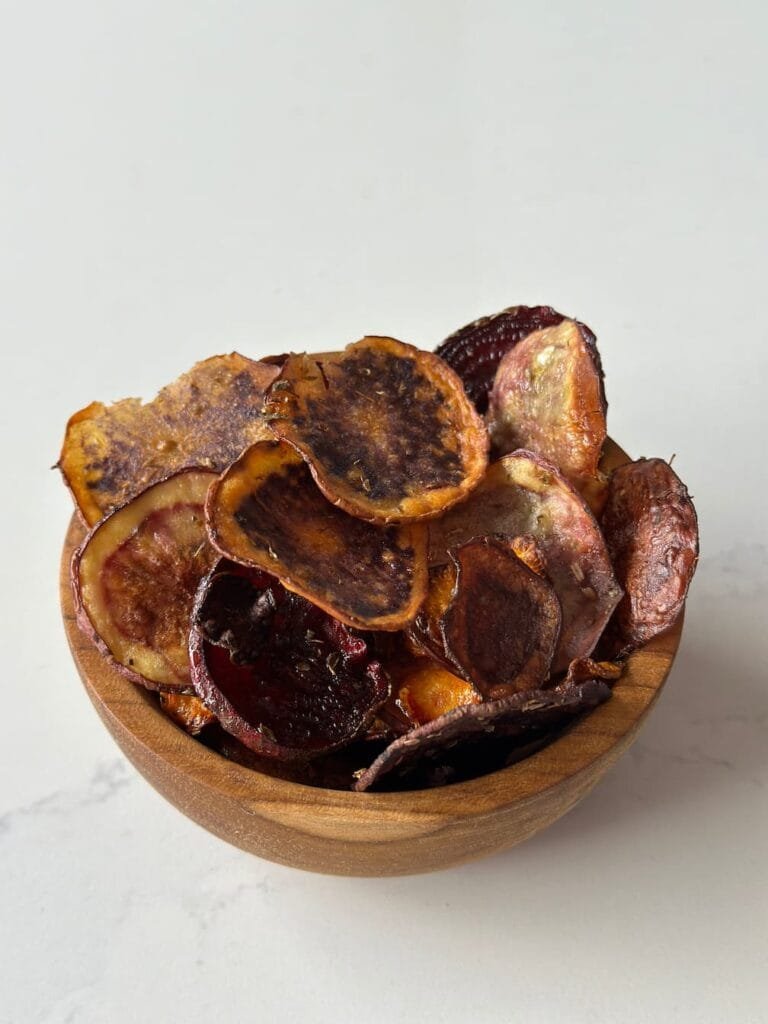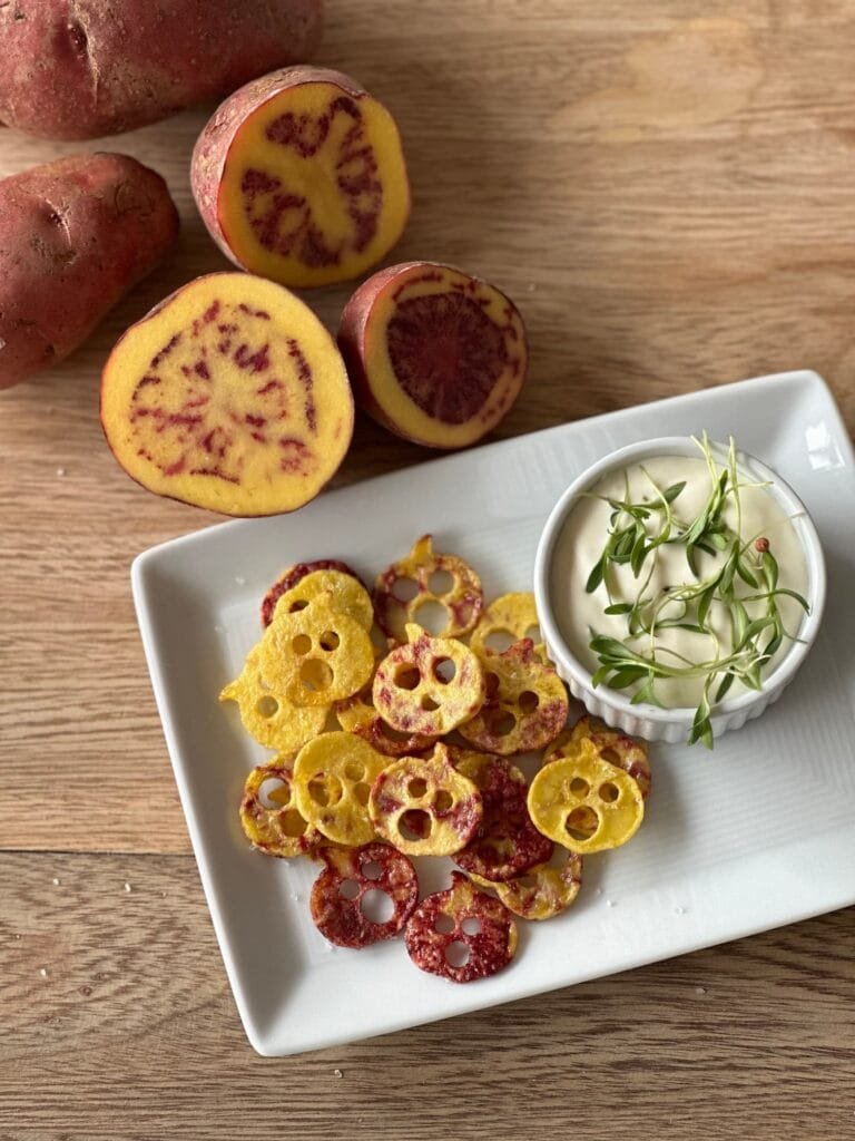 Haz tus propios chips en casa de papas nativas, remolacha y MiniZanahorias, son la mezcla perfecta y quedan deliciosas. La clave es cortar en rodajas delgadas.
