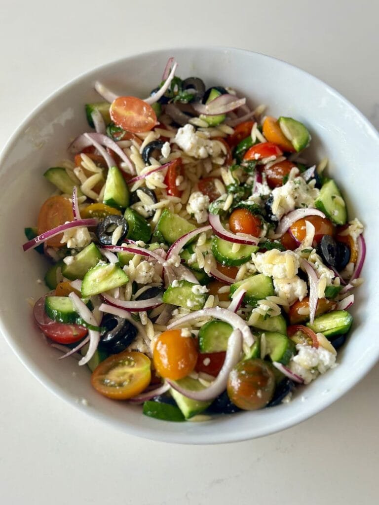 Ensalada griega con orzo. Es muy fácil de hacer y queda deliciosa. ¡Pruébala!