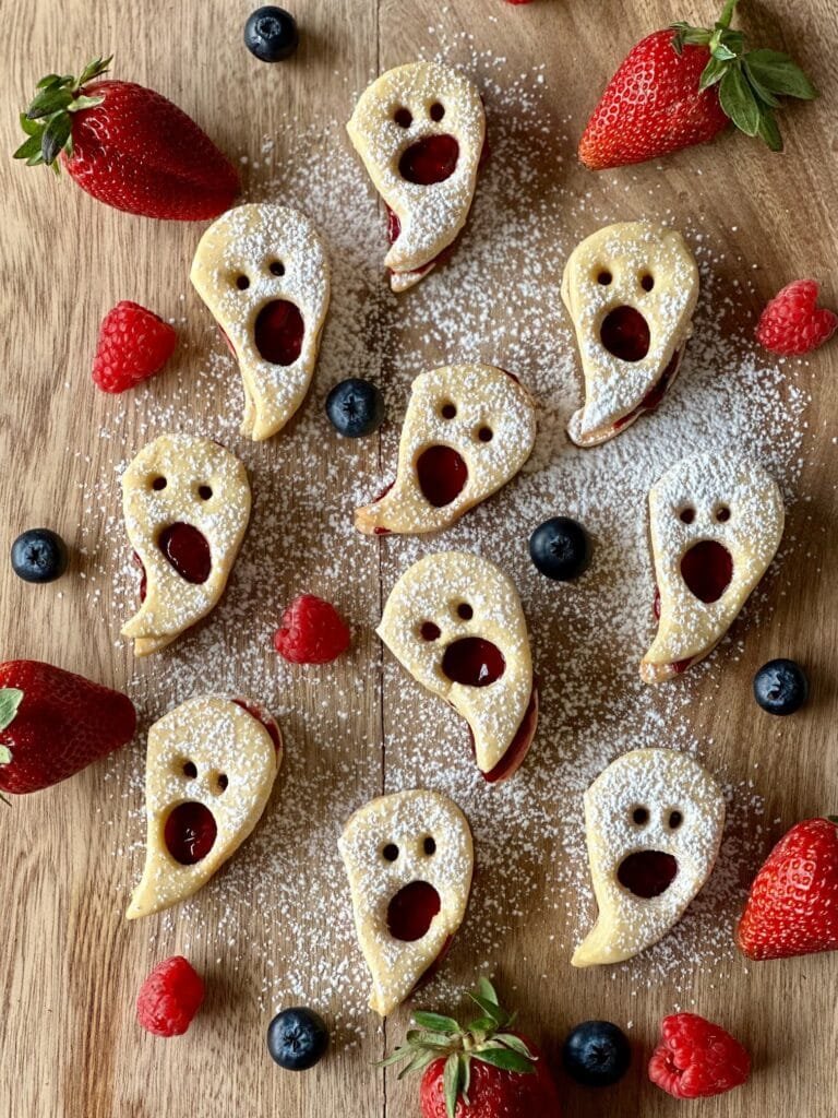 Galletas de fantasmas rellenas de mermelada de frutos rojos, son el postre perfecto para hacer con los niños en Halloween. Quedan divinas y deliciosas.