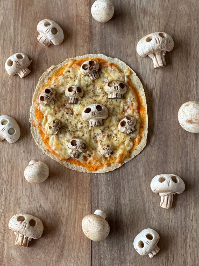 Sppoky Pizza para hacer con los niños en Halloween. Diviértete haciendo estas calaveras de champiñones