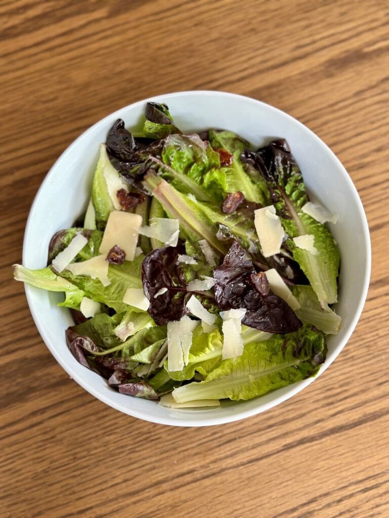 Una ensalada sencilla pero deliciosa. Mezcla cogollos morados con queso parmesano en lonjas y dátiles para una mezcla de sabores que no necesita nada más que aceite de oliva.