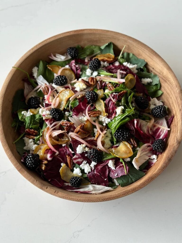 Haz esta ensalada de hojas baby y radicchio. Queda deliciosa con el toque final de peras caramelizadas, queso feta y moras. Ponle color a tus platos.