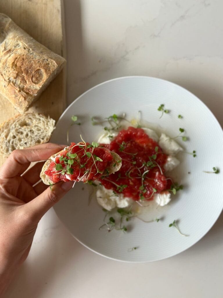 Tomatina con burrata servido sobre pan francés. Una entrada fresca y deliciosa para cualquier momento.