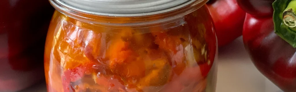 Pimentones encurtidos hechos en casa, ideal como snack, para sanduches y ensaladas. Los guardan en aceite de oliva, vinagre de vino, ajo, sal y pimienta y el aceite que sobró en la lata de cuando se hornearon. Se puede guardar en la nevera hasta por 2 semanas.